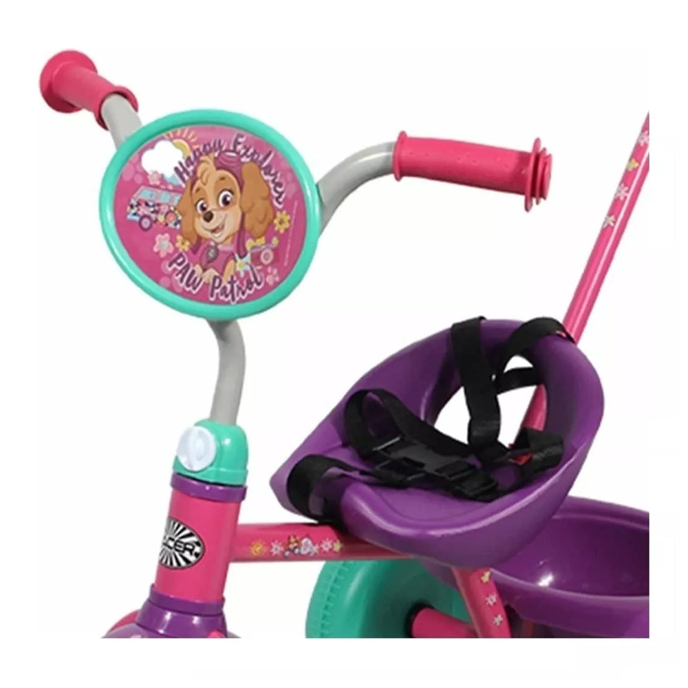 - Diseño y Colores de PAW Patrol: El triciclo presenta una combinación de colores en tonos de morado, rosa y azul verdoso (menta), inspirados en el uniforme de la cachorra voladora, Skye.