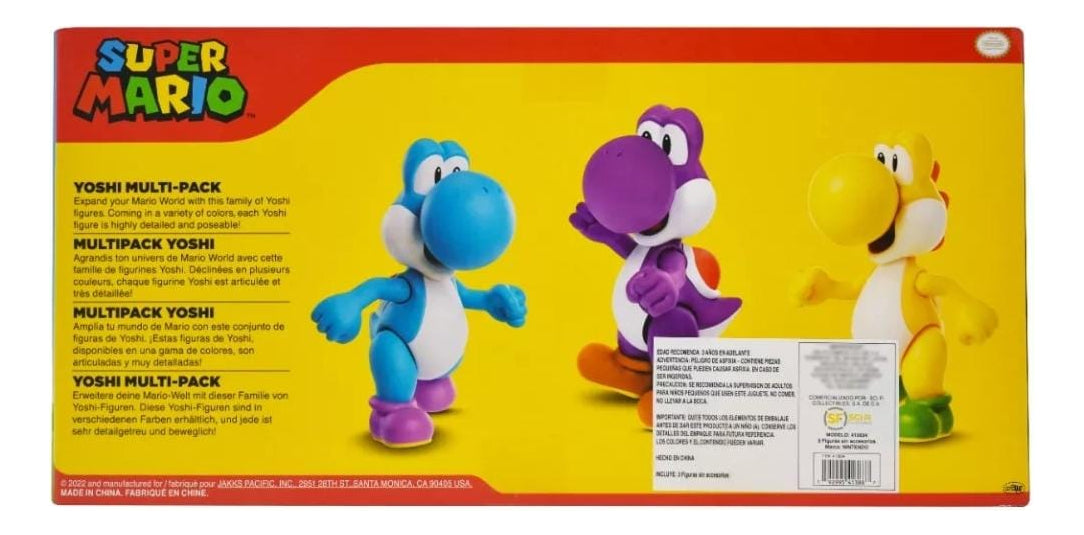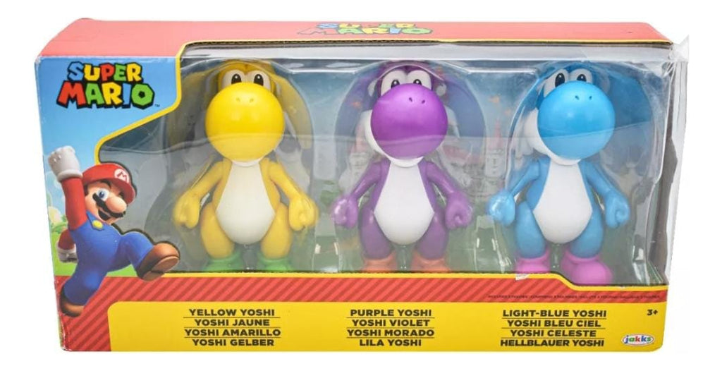 - ¡Comienza a construir tu Super Mario World hoy! Auténticas cifras de cuatro pulgadas de los videojuegos de Super Mario. Incluye: Yoshi amarillo, Yoshi morado y Yoshi azul claro