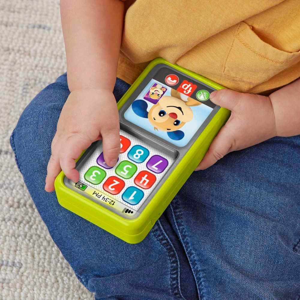 Teléfono inteligente de juguete interactivo con los amigos de Ríe y Aprende®, Perrito y Hermanita, además de divertidas luces, sonidos y canciones para aprender Cuenta con más de 75 canciones, sonidos y frases para que los niños aprendan a contar, los números, las formas, los colores, los sentimientos y el clima. Usa el botón del mundo para seleccionar un idioma: español, portugués, inglés. 2 modos de aprendizaje: Presiona los botones numéricos del 1 al 9 para activar luces y canciones. Desliza la lengüeta hacia arriba para mostrar los 9 botones de 'aplicaciones' con canciones y frases nuevas Desliza hacia arriba para divertirte aprendiendo con el juguete de teléfono inteligente 2 en 1 Desliza para Aprender Ríe y aprende® de Fisher-Price®. Este interactivo teléfono de juguete se ve real y cuenta con los amigos Ríe y Aprende® de tu bebé, Perrito y Hermanita, además de dos modos de aprendizaje con botones de 'aplicación' y números que se pueden presionar para activar luces, canciones y sonidos. A medida que los niños pequeños presionan, deslizan y activan las actividades en la simulación de teléfono, ejercitarán adecuadamente sus habilidades de motricidad fina, mientras las canciones y las frases educativas les presentan los números y les enseñan a contar, las formas, los colores y mucho más. Usa el botón del mundo para seleccionar un idioma: español, portugués, inglés.