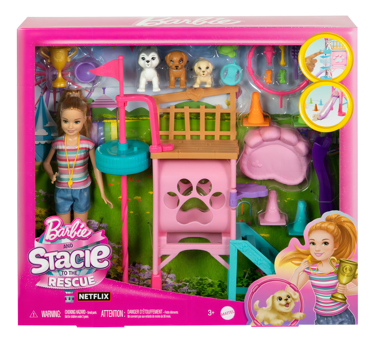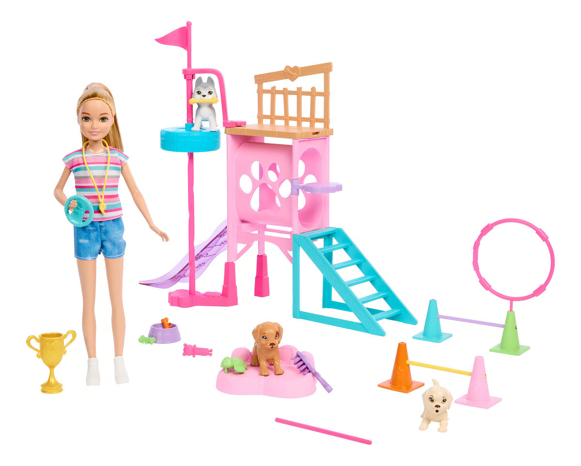 - ¡Es momento de entrenar a las mascotas más adorables! Los niños y las niñas podrán mostrar su amor por las mascotas con la muñeca Stacie y el set de juego de Entrenadora de Cachorritos, cuenta con una torre giratoria, una escalera y un tobogán. También tiene conos que se conectan a los aros y a los palos de entrenamiento para que los perritos realicen acrobacias y ejercicios