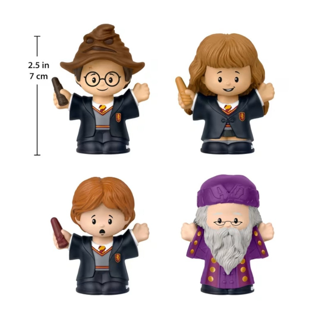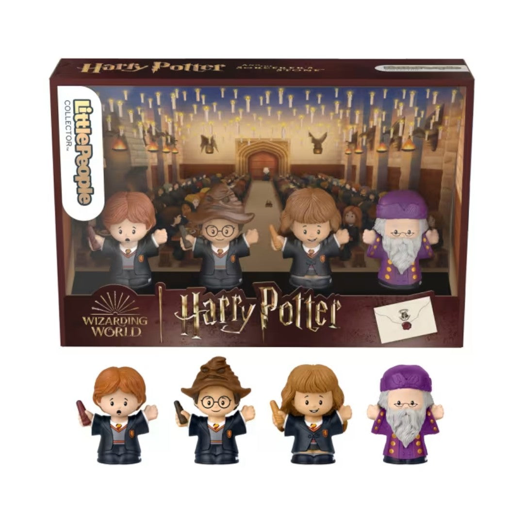 Brujas, magos y fans de los muggles™ disfrutarán recordando su primer viaje al mágico castillo de Hogwarts™ con esta edición especial de Little People Collector™, que conmemora la primera película de la saga Harry Potter™, Harry Potter y la Piedra Filosofal™. Revive la Ceremonia de Selección en el Colegio Hogwarts de Magia y Hechicería con este set de figuras, que incluye a Harry Potter™, Ron Weasley™ y Hermione Granger™ con sus uniformes escolares, además del director Albus Dumbledore™ con su túnica morada. La caja con ventana da vida al Gran Comedor de Hogwarts con un precioso detalle para que coleccionistas y fans lo admiren.