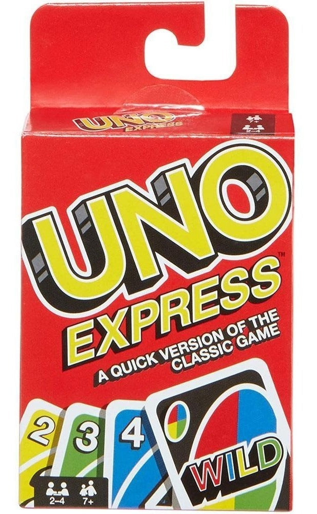 • UNO es el clásico y amado juego de cartas que es fácil de llevar a todos lados e imposible de soltar. UNO.Express ofrece toda la diversión de UNO, pero con una dinámica de juego más rápida, que le permite a los jugadores terminar las rondas más rápido. La baraja más pequeña hace que esta versión de UNO sea portátil y fácil de llevar a todos lados.Los jugadores toman turnos para hacer pares con una carta en su lote, con la carta que se muestra en la parte superior de la baraja, ya sea por su color o su número. Las cartas de acción especial brindan momentos que cambian el rumbo del juego y cada una cumple una función que te ayuda a vencer a tus oponentes. Y no olvides gritar “UNO.” cuando te quede una sola carta. Gana el primer jugador en deshacerse de todas las cartas de su mano antes de que lo hagan sus oponentes. Excelente juego de mesa para una noche de juegos para 2 a 4.jugadores. Incluye 56 cartas e instrucciones.