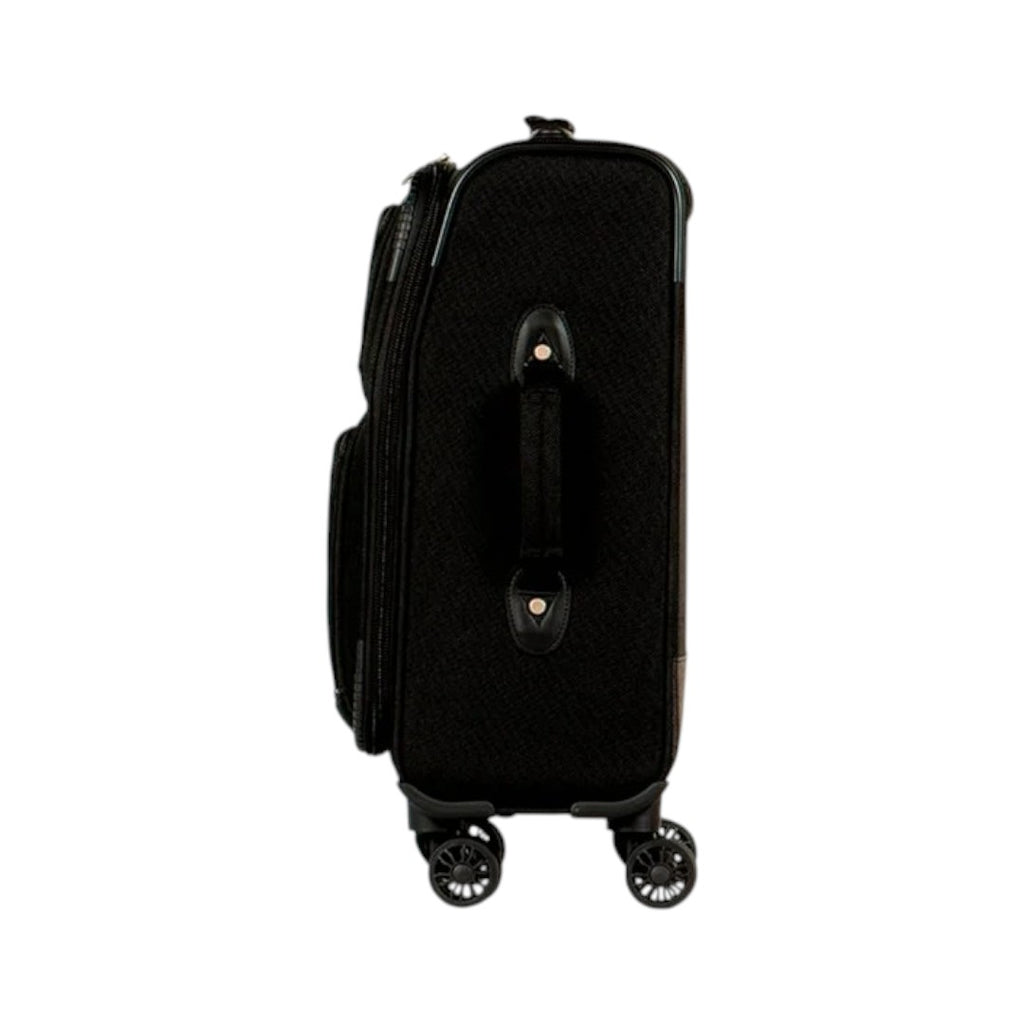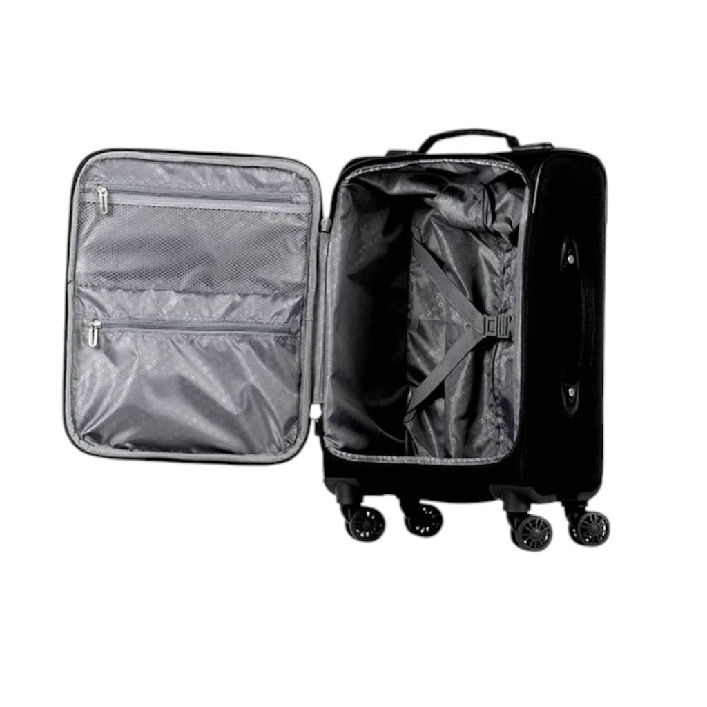 - Exterior: Sistema multidireccional de cuatro ruedas. Carro con botón liberador. Bolsillos frontales que añaden capacidad. Tiradores metálicos con logotipo.