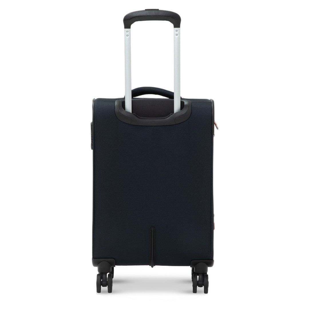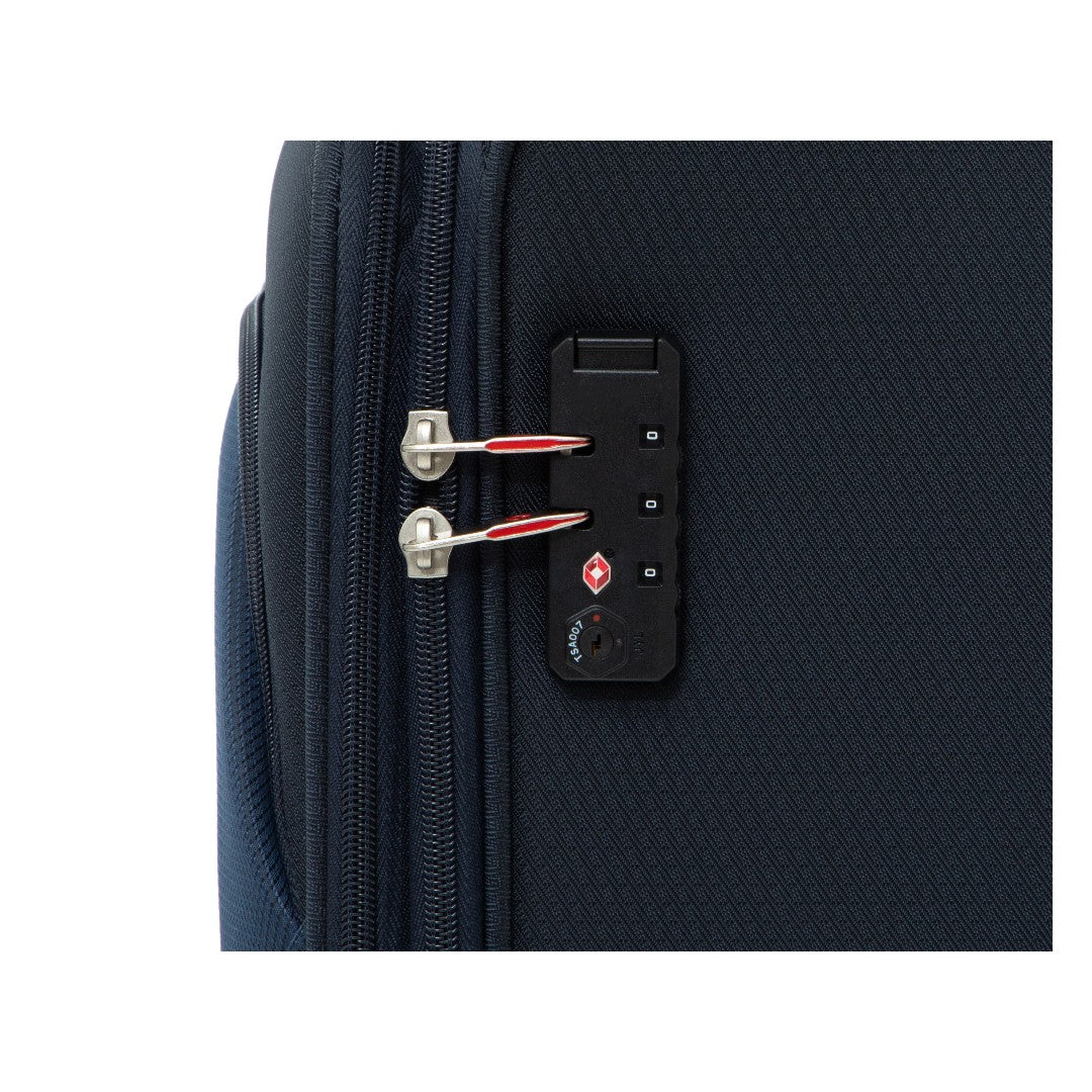- Exterior: Sistema multidireccional de cuatro ruedas. Carro con botón liberador. Expandible en los tres tamaños. Dos bolsillos frontales que añaden capacidad. Asa superior, lateral e inferior en mediano y grande. Candado TSA para mayor seguridad. Tiradores metálicos con logotipo.