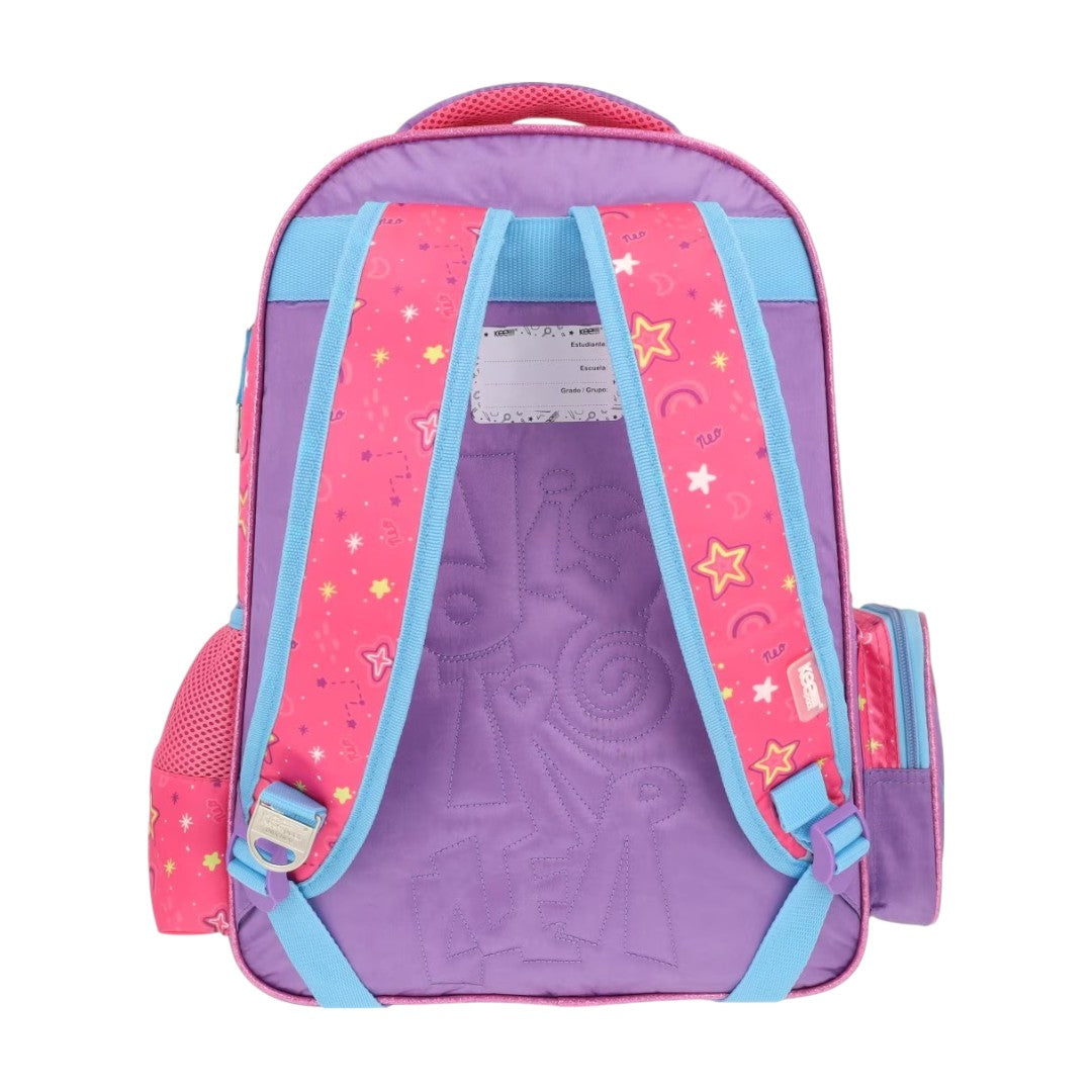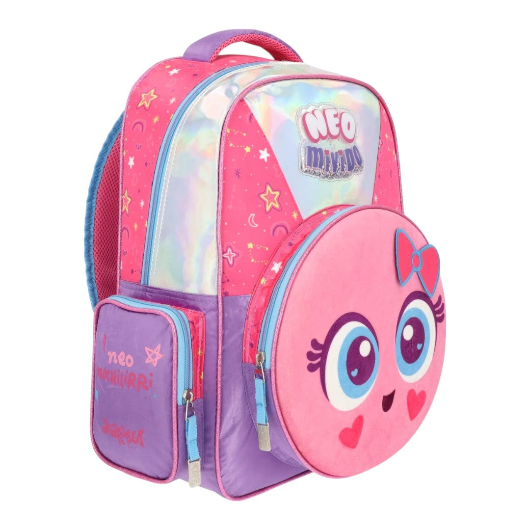 Con un adorable personaje Neo de grandes ojos tiernos, mejillas sonrosadas en forma de corazón y un coqueto moño, esta mochila captura la esencia de la dulzura y la diversión. Los colores vibrantes como el rosa, el morado y toques de azul celeste, junto con estampados de estrellas, lunas y arcoíris, te transportarán a un mundo de ensueño. Los detalles holográficos le dan un toque moderno y brillante que no pasará desapercibido.