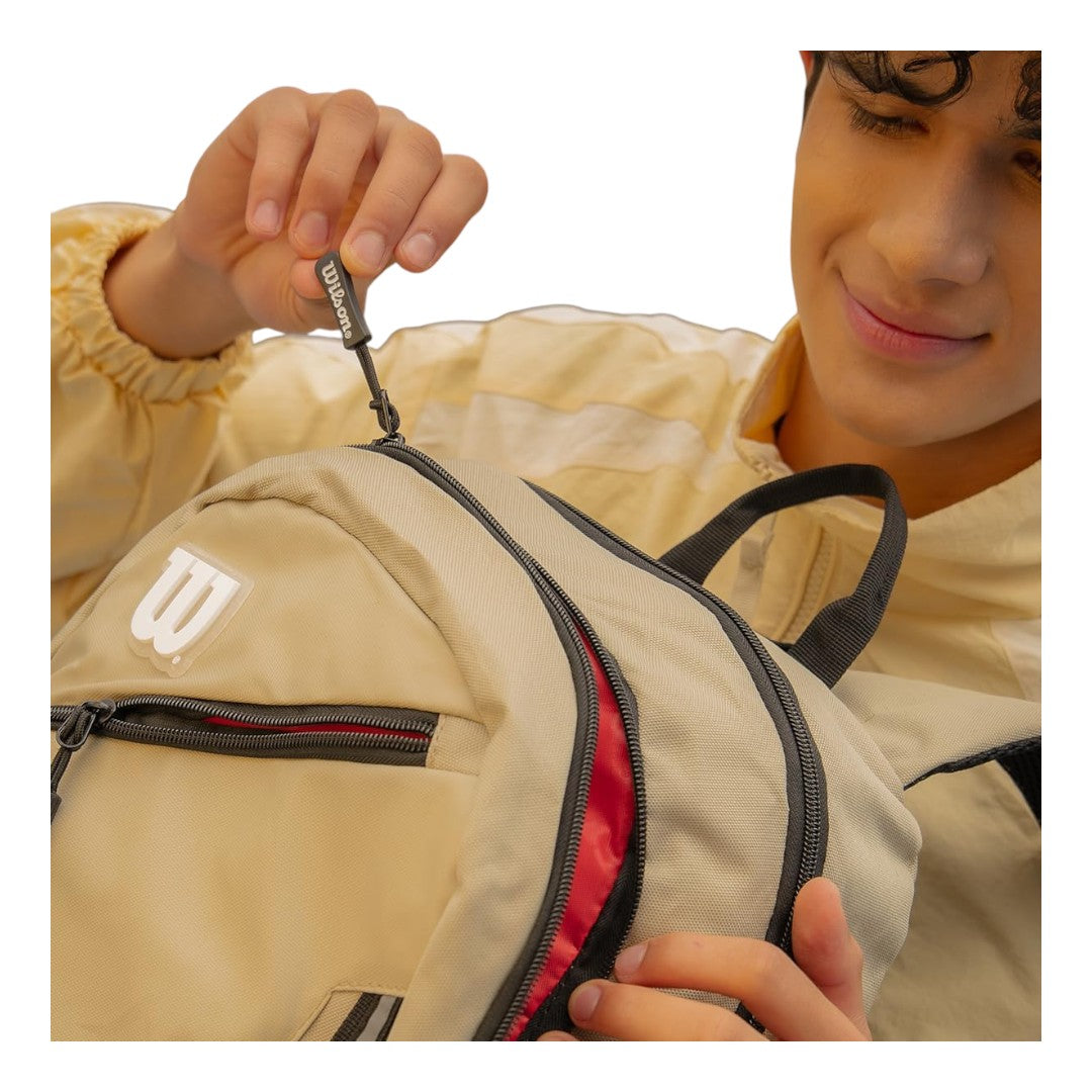 Esta mochila Wilson es el accesorio ideal para quienes buscan un equilibrio perfecto entre un estilo deportivo moderno y una funcionalidad excepcional. Diseñada en un sofisticado tono arena con detalles en negro, es una excelente opción tanto para estudiantes como para fans de los deportes y la vida urbana.