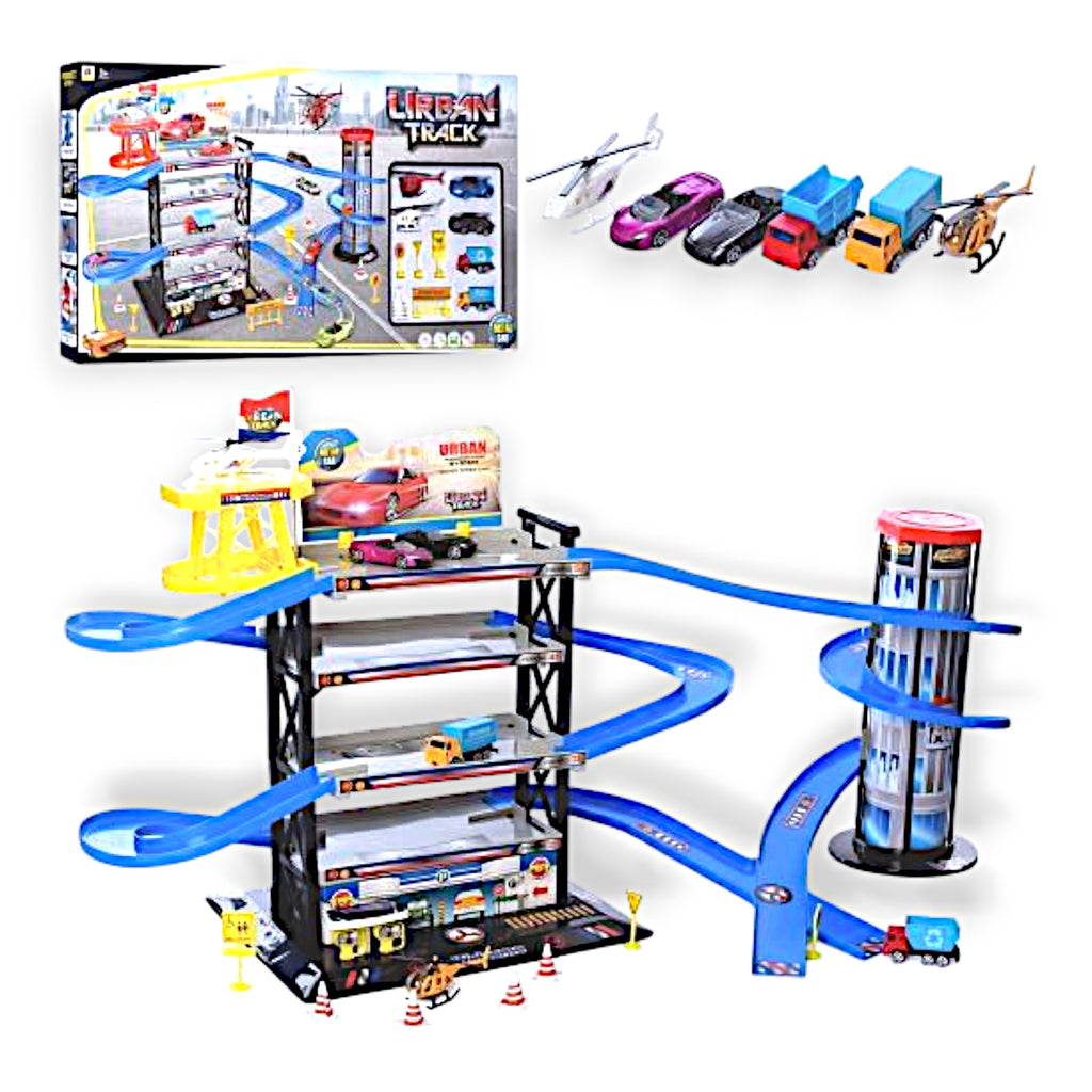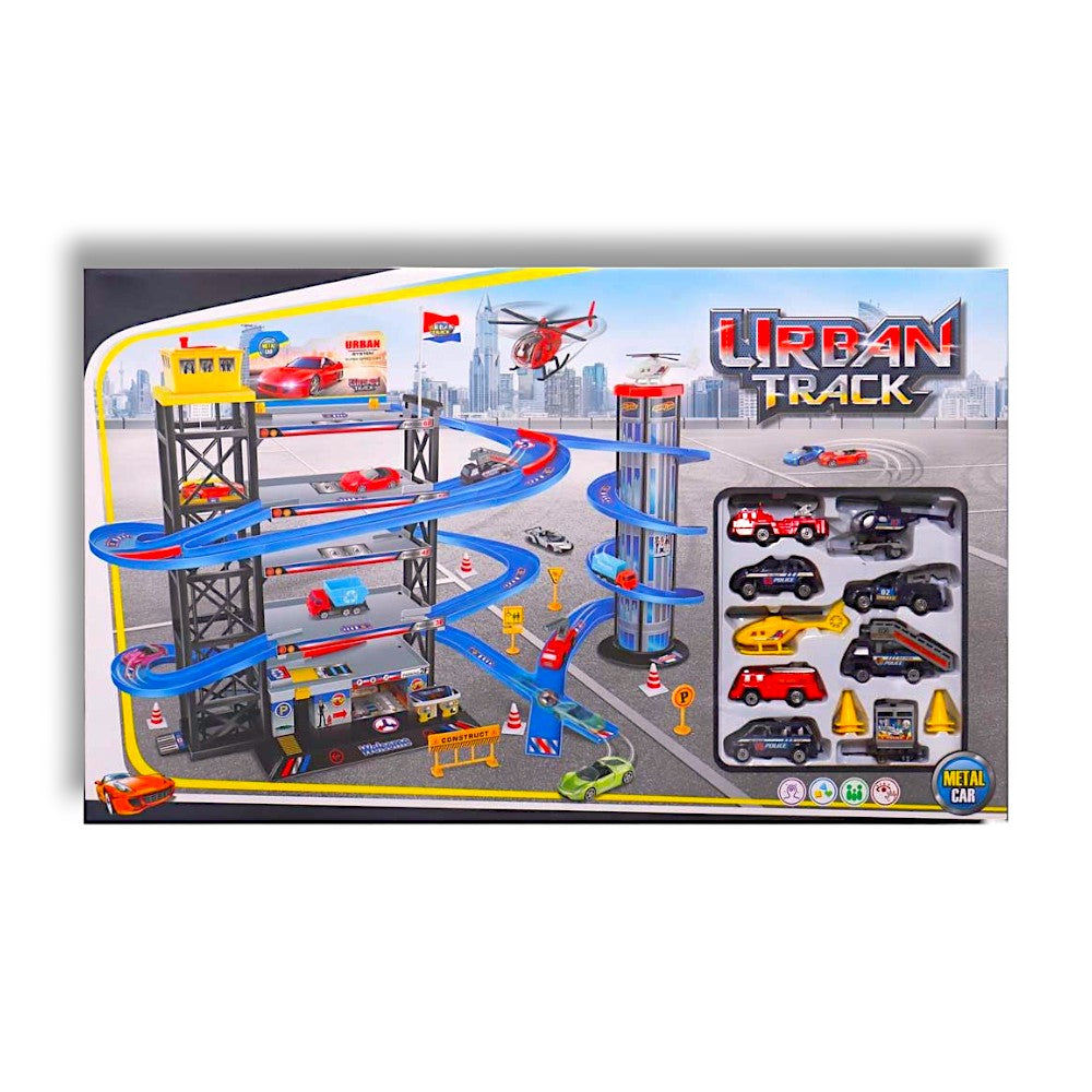 ¡Prepara tus motores para la acción en esta espectacular pista de varios niveles! La 'Urban Track' es el sueño de todo pequeño fan de los vehículos, ofreciendo horas de juego imaginativo con coches, helicópteros y emocionantes rampas de velocidad.