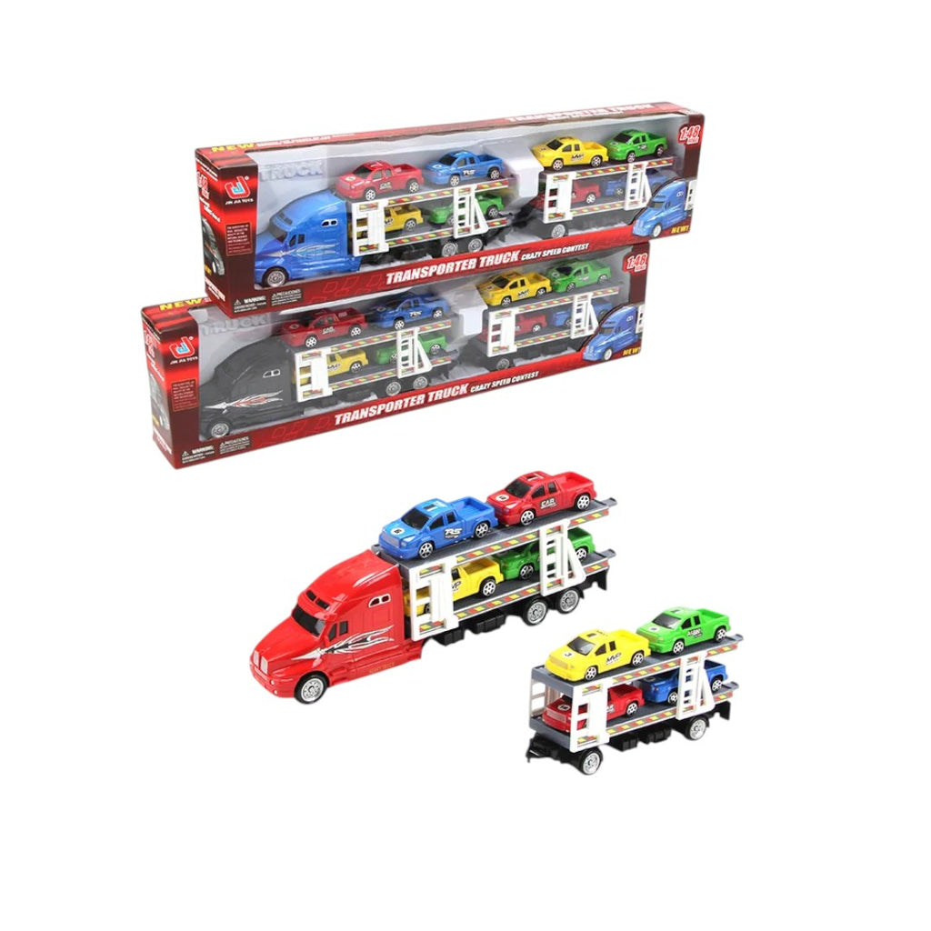Lleva la logística de carreras al extremo con el TransporterTruck 'Crazy Speed Contest' de Doble Remolque de Jin Jia Toys.